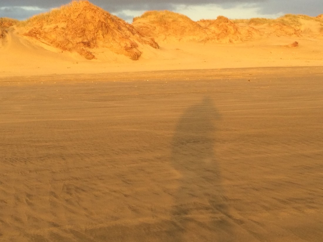 To get the first ball bowled, here’s a shot I took by sunset-light at the end of the first leg, which is 100 kilometres over four days, straight down the country’s longest beach to a little town called Ahipara. When I got there I had been walking for 14 hours and was in a dreamy haze of leaky blisters, leg-aches and extreme exposure to nature. In that state, what I thought was this: