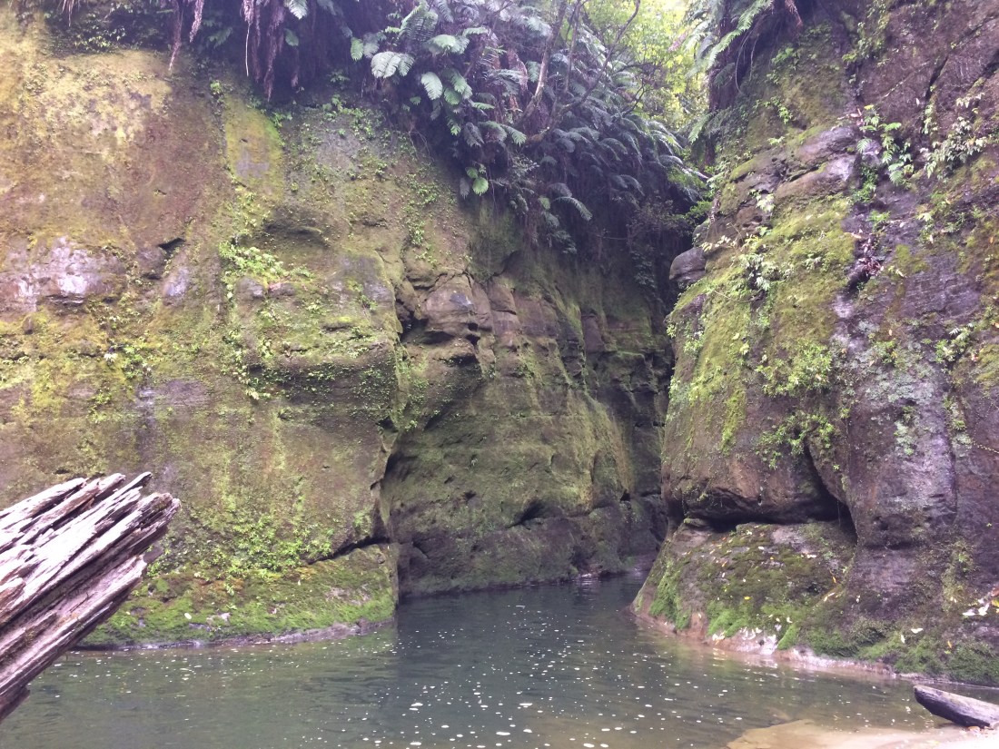 A steep track and ladder-like wooden stairs lead down to the bottom. It’s quite a magical, hidden place – a deep pool, carved out by floods, the sky a small window high above, lined with dark, dripping bush.