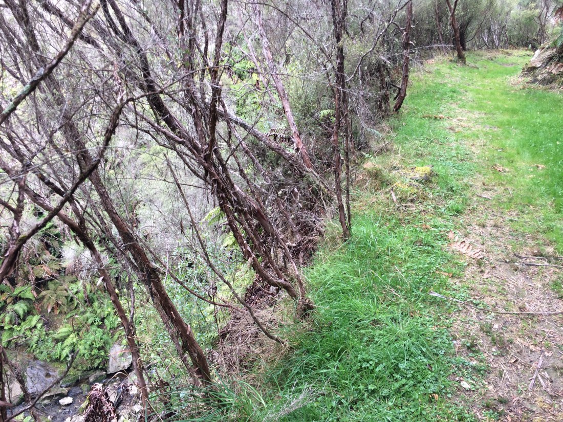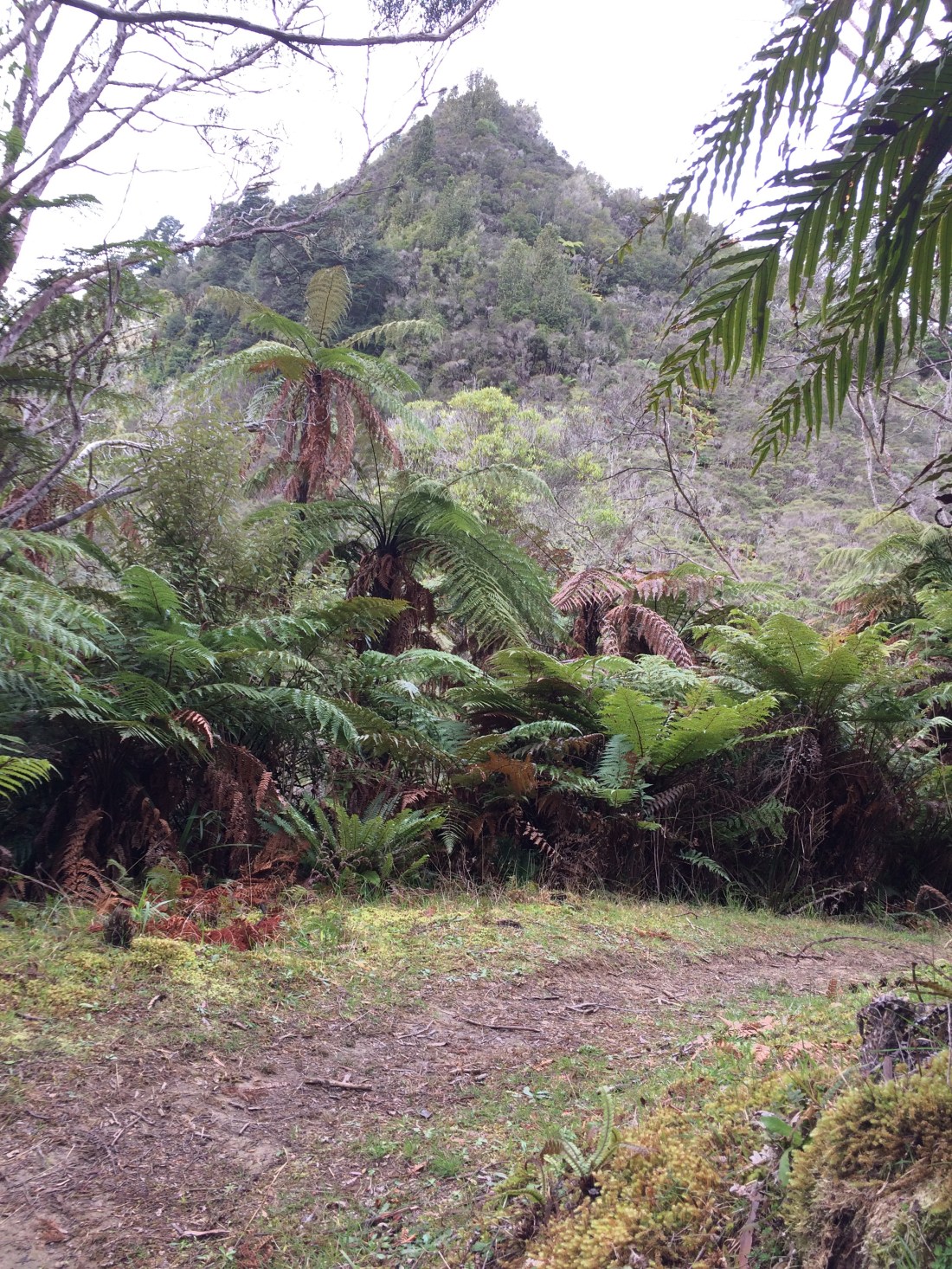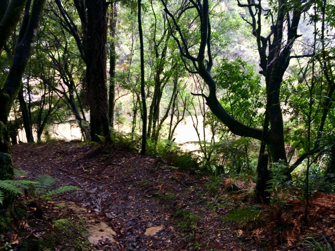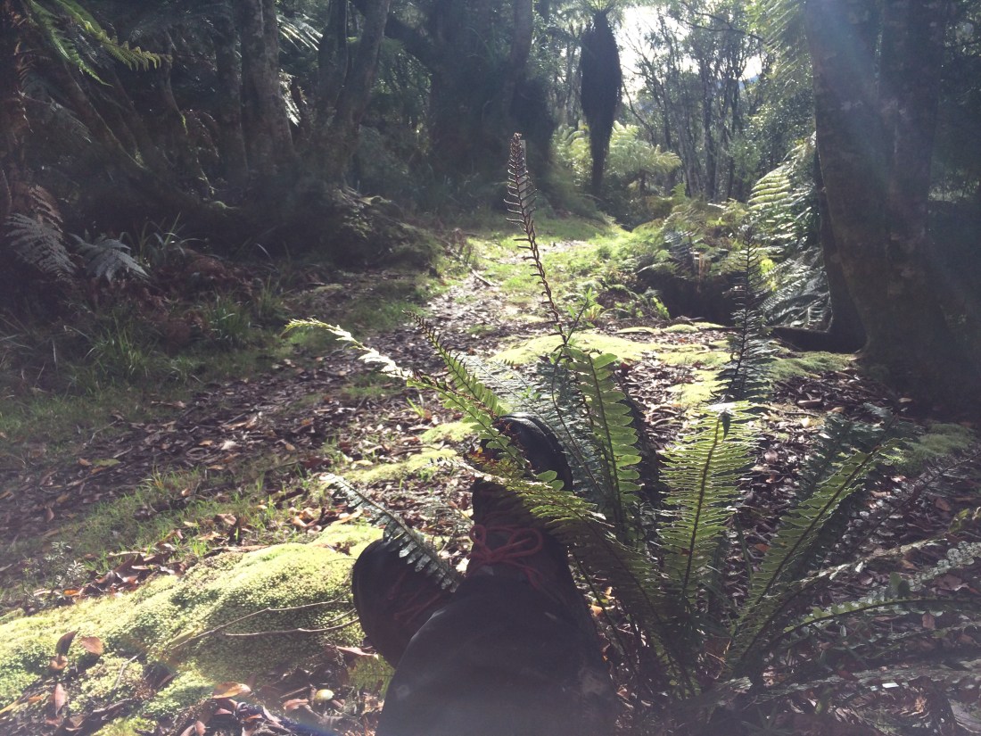 Further on, a jarring change. There’s been some kind of widespread damage to a block of private land that comes right up to the lush DOC reserve I’d been blissfully bowling through. They’ve sprayed it maybe, or there’s been a scrub fire. Beneath the ruined bush, I could see new grass so maybe this rolling country is being put into pasture. Or returned to it, if the bush is actually regrowth. Either way it felt sad, the contrast between the deadened, private land and the exuberant public reserve. I found myself mulling (not for the first time on this trail): Do we have to wreck the forest to grow things?