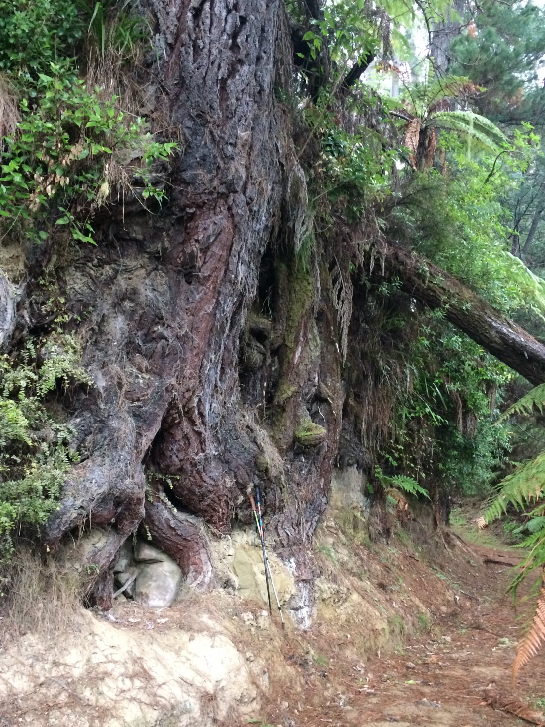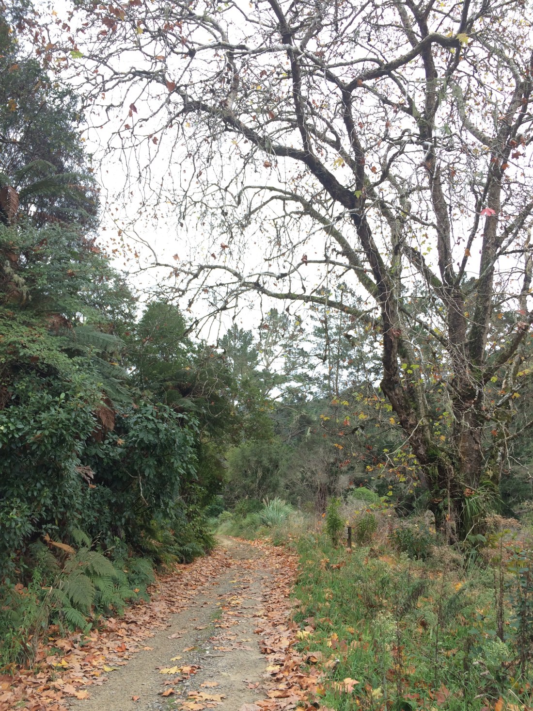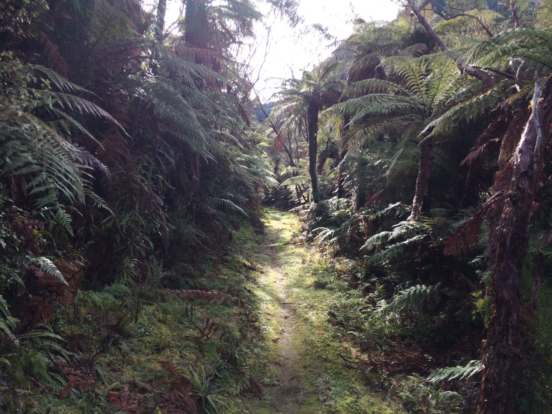 Further on, a jarring change. There’s been some kind of widespread damage to a block of private land that comes right up to the lush DOC reserve I’d been blissfully bowling through. They’ve sprayed it maybe, or there’s been a scrub fire. Beneath the ruined bush, I could see new grass so maybe this rolling country is being put into pasture. Or returned to it, if the bush is actually regrowth. Either way it felt sad, the contrast between the deadened, private land and the exuberant public reserve. I found myself mulling (not for the first time on this trail): Do we have to wreck the forest to grow things?