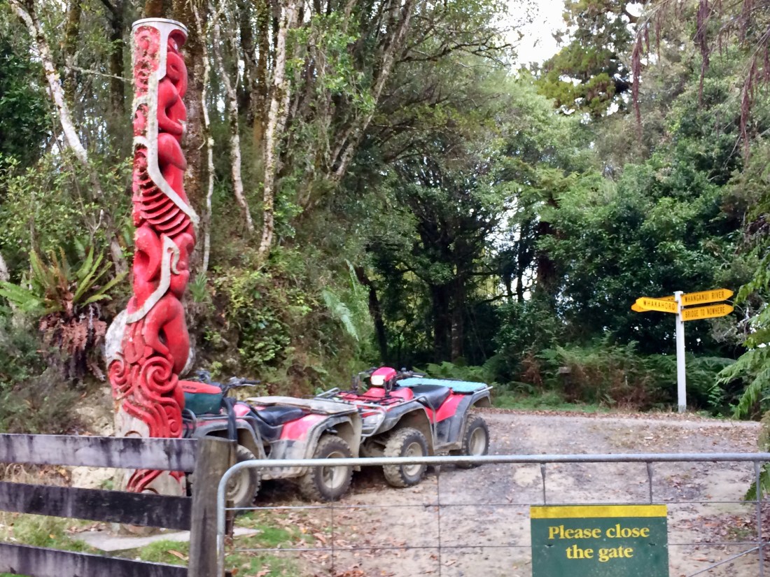 A couple of hours’ uphill slog ensued, through vibrant bush alongside the ever-more rugged upper reaches of the Kaiwhakauka. Then I emerged at a gate, and more signs of that jarring relationship humans sometimes have with the wild: yellow AA road signs, and two quad bikes parked hard up against a carved pou, its elegant lines much more in keeping with the surrounds than the bikes – even if they and the pou were a similar colour.