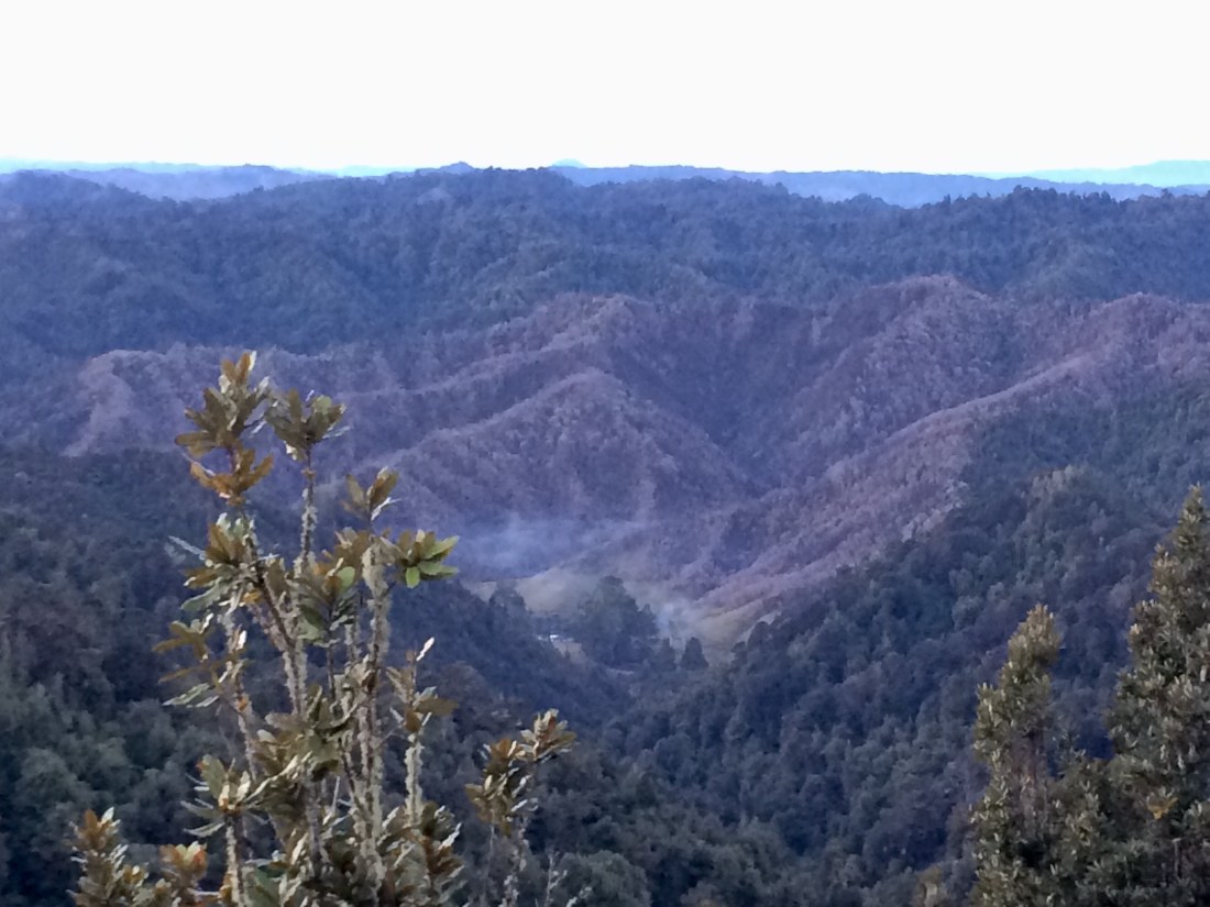 From near the trig point (661m), at a rare opening in the canopy I could see from above, to the north and east, the steep-sided bluffs I’d been walking beneath and gradually edging up all day: