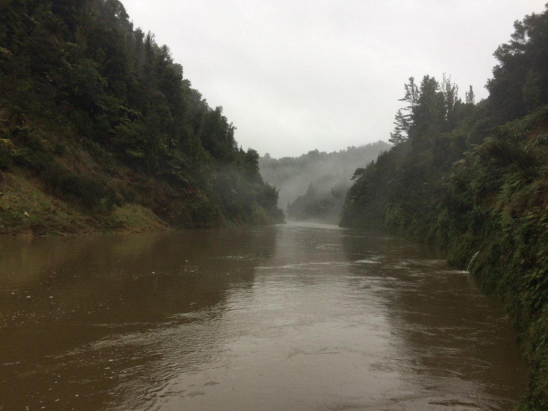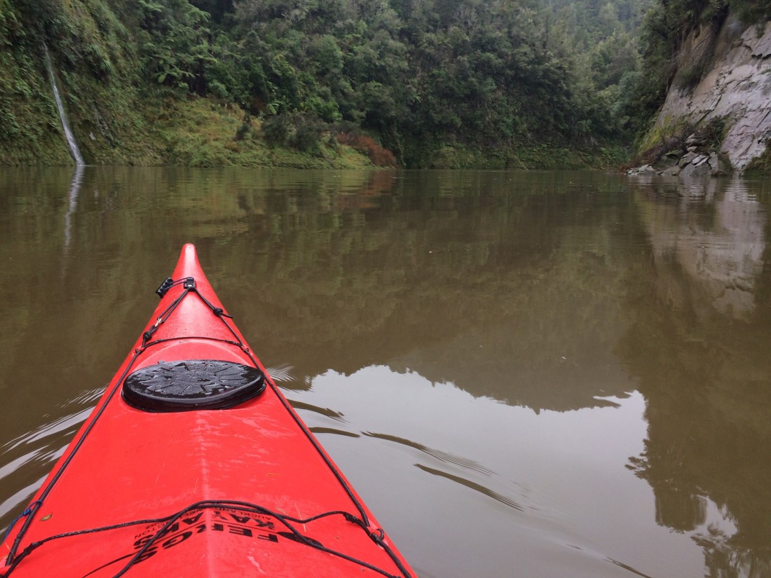 I nosed cautiously out into the main current, feeling the kayak’s stable trim in the water, but not sure what to expect – I hadn’t paddled this river in spate before. But it wasn’t bad; the current was discernible, but not fierce. I ferry-glided across to the other side and got out to adjust my foot-rests. Three-clawed prints in the mud got me briefly excited, thinking of kiwi. But later I realised they were probably just pūkeko: