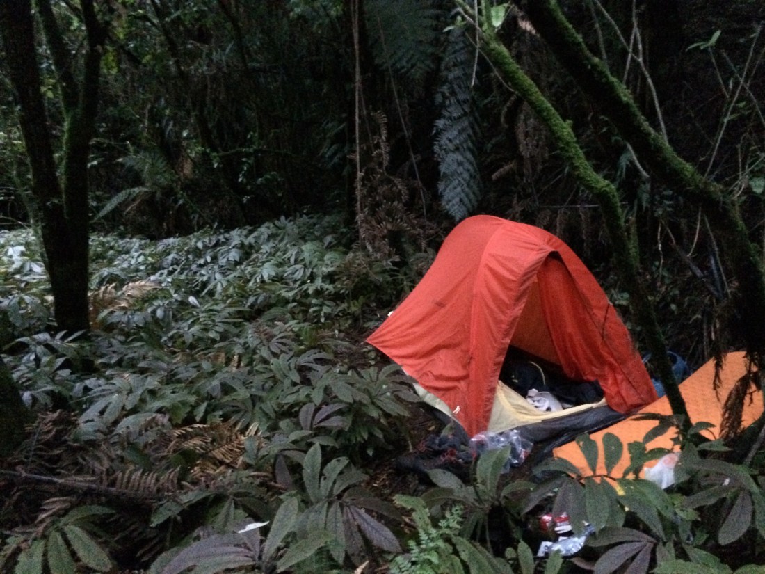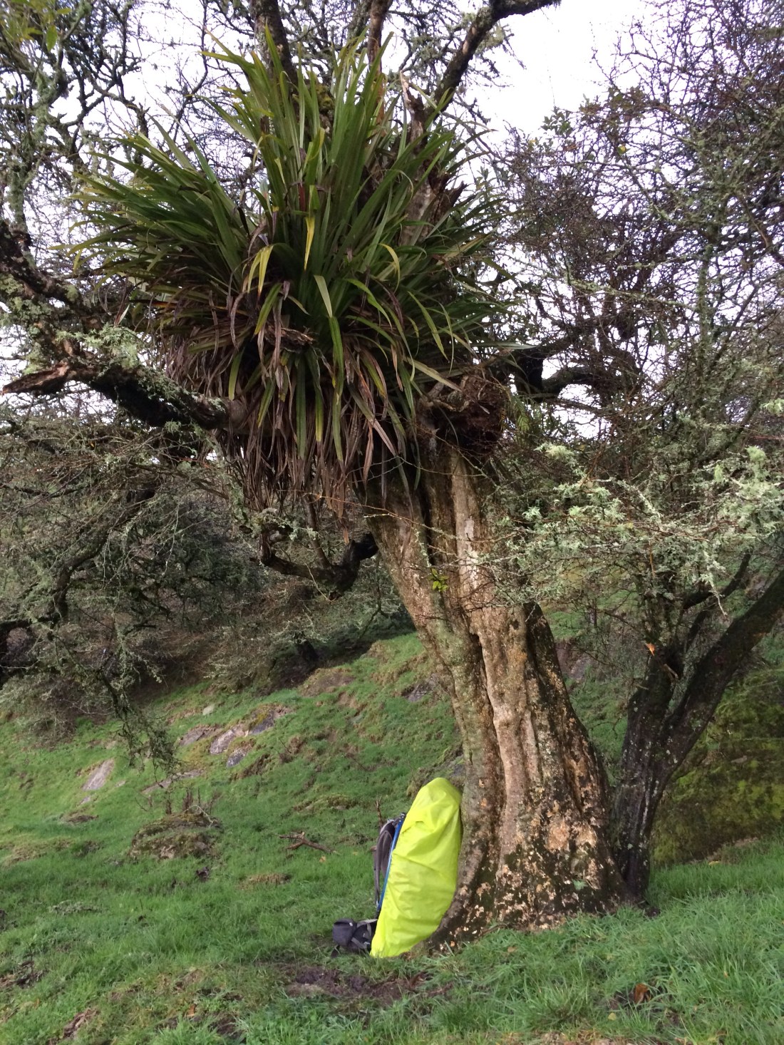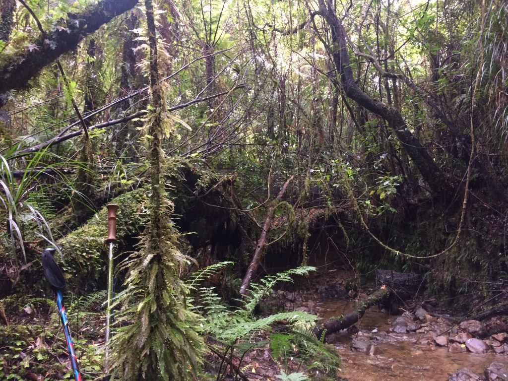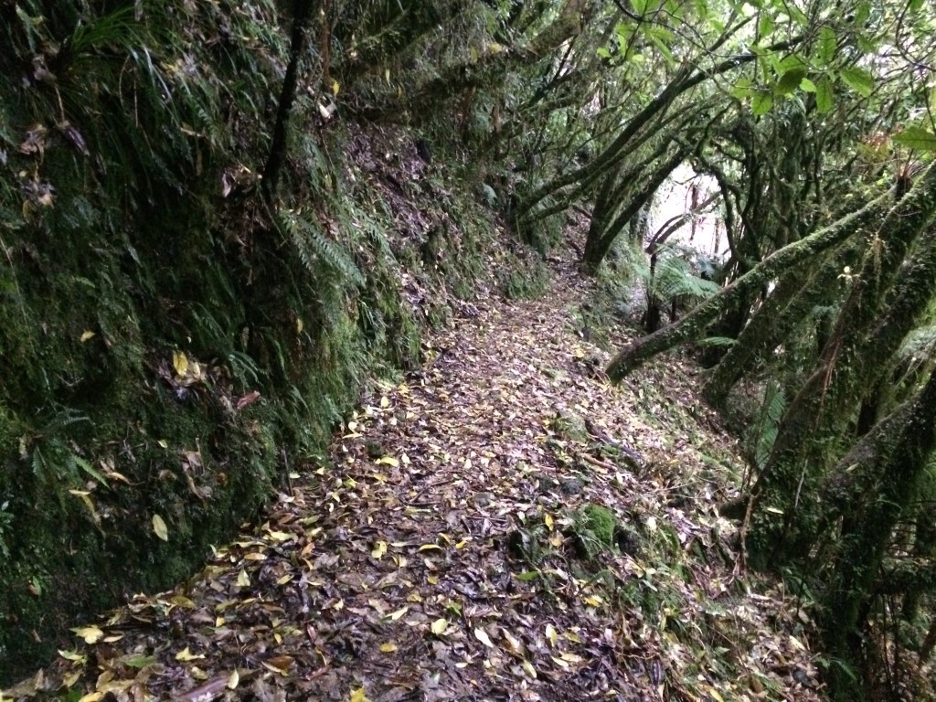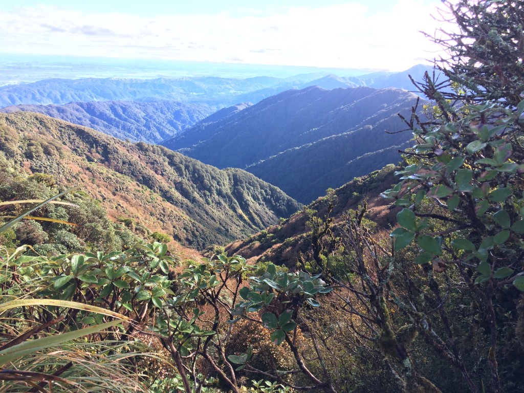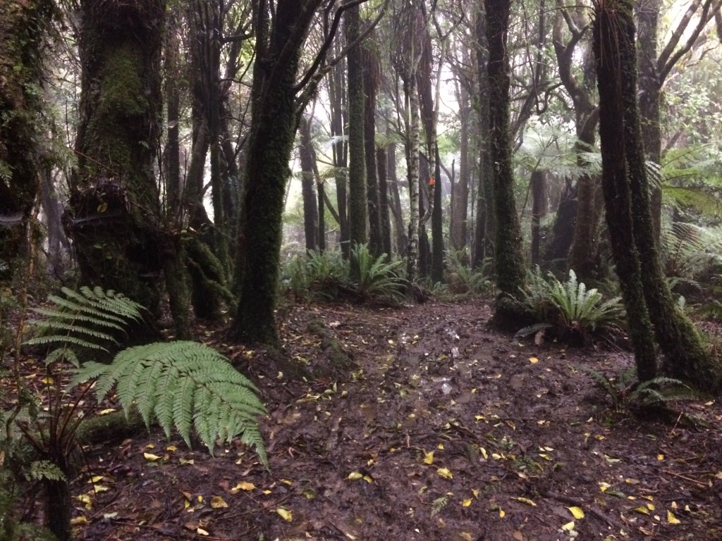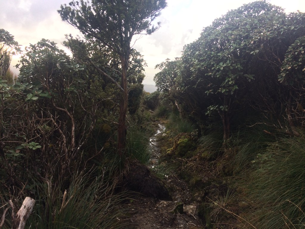It’s an unrelelenting, muddy slog, up and up, but eventually I came out in the subalpine zone – low, gnarled shrubs, a stand of leatherwood, tussock.
