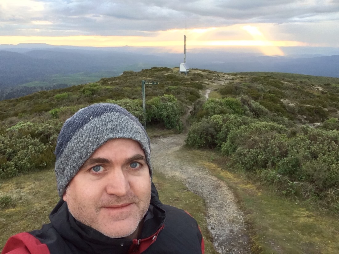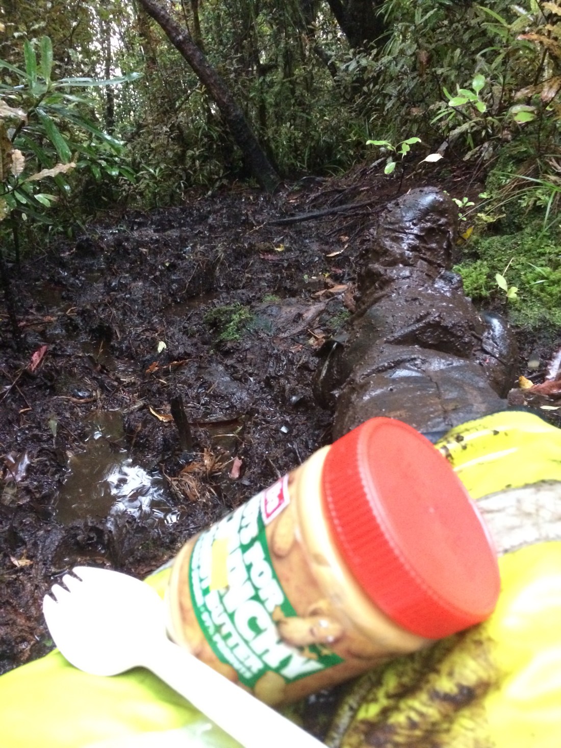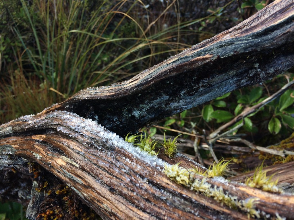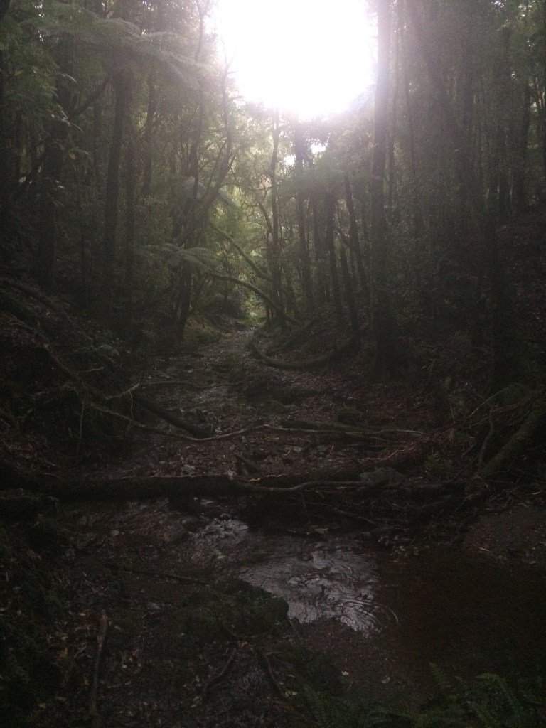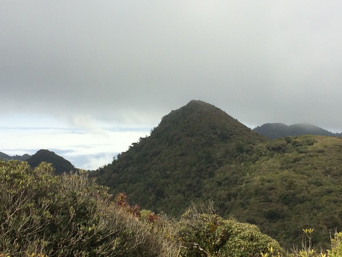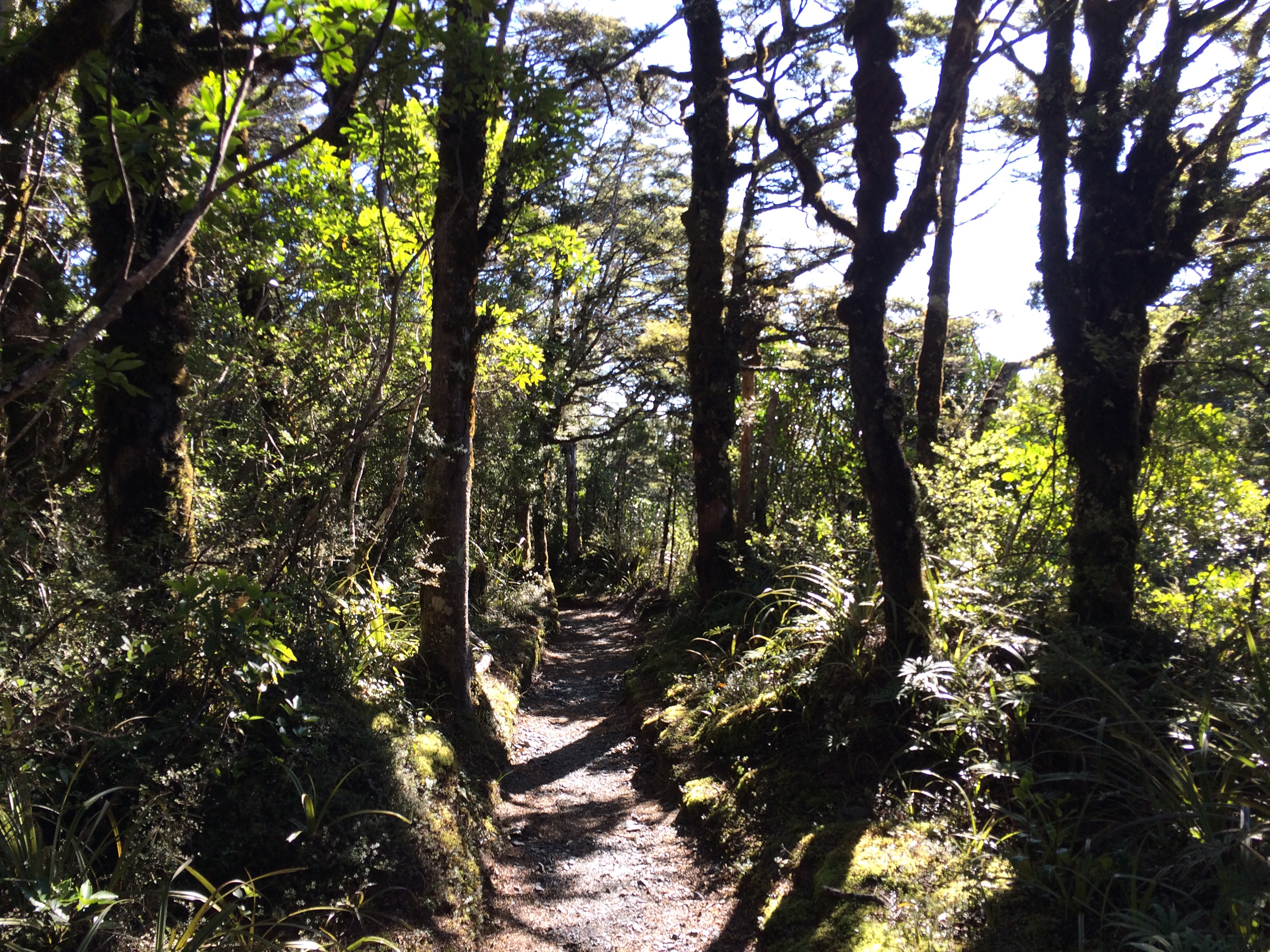 It’s an unrelelenting, muddy slog, up and up, but eventually I came out in the subalpine zone – low, gnarled shrubs, a stand of leatherwood, tussock.