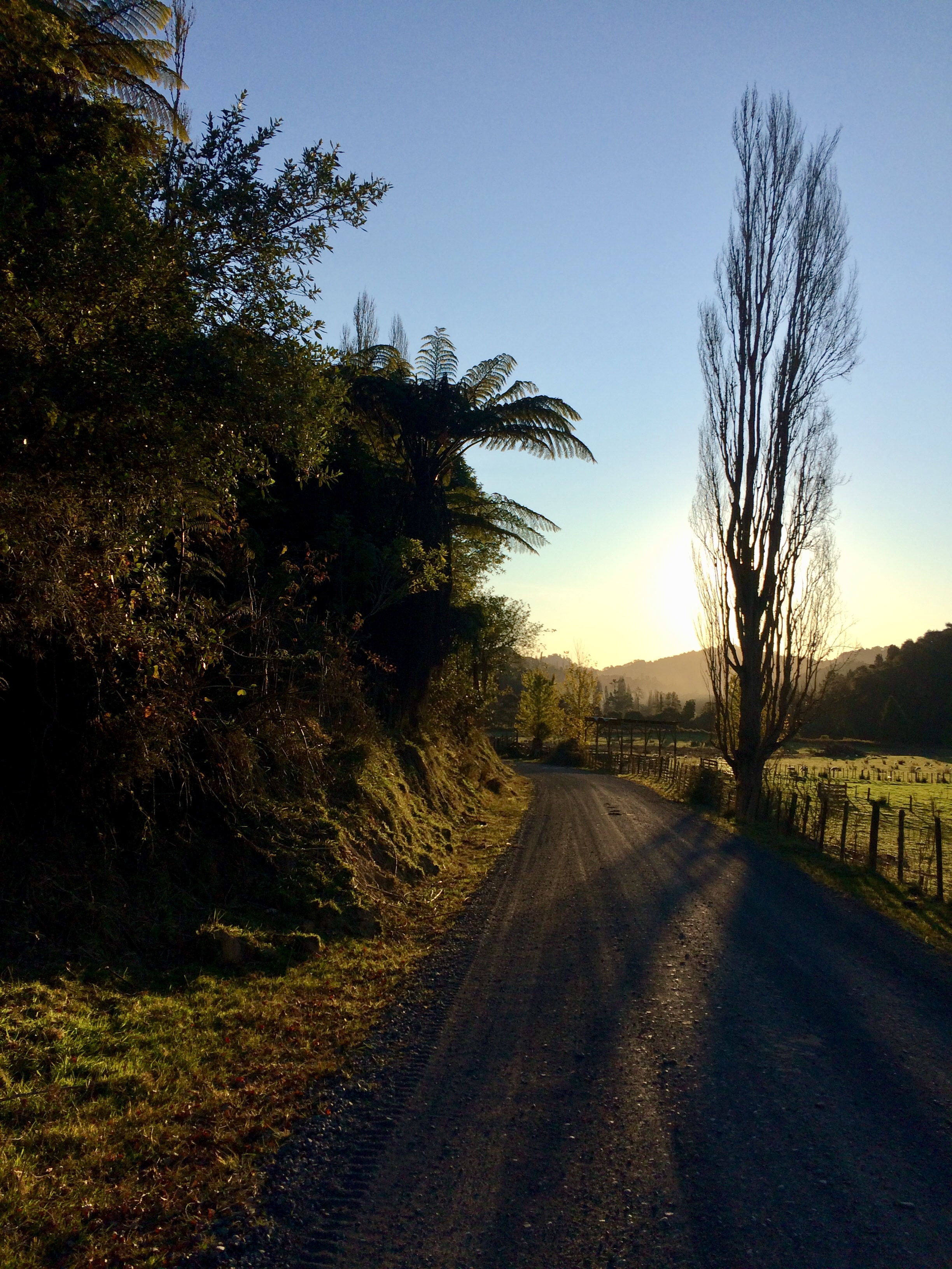 Turning left into Poads Road, you are now heading straight toward the bush, following the Ōhau River. The setting sun lit up a farm’s trees; it was still too early for blossom.