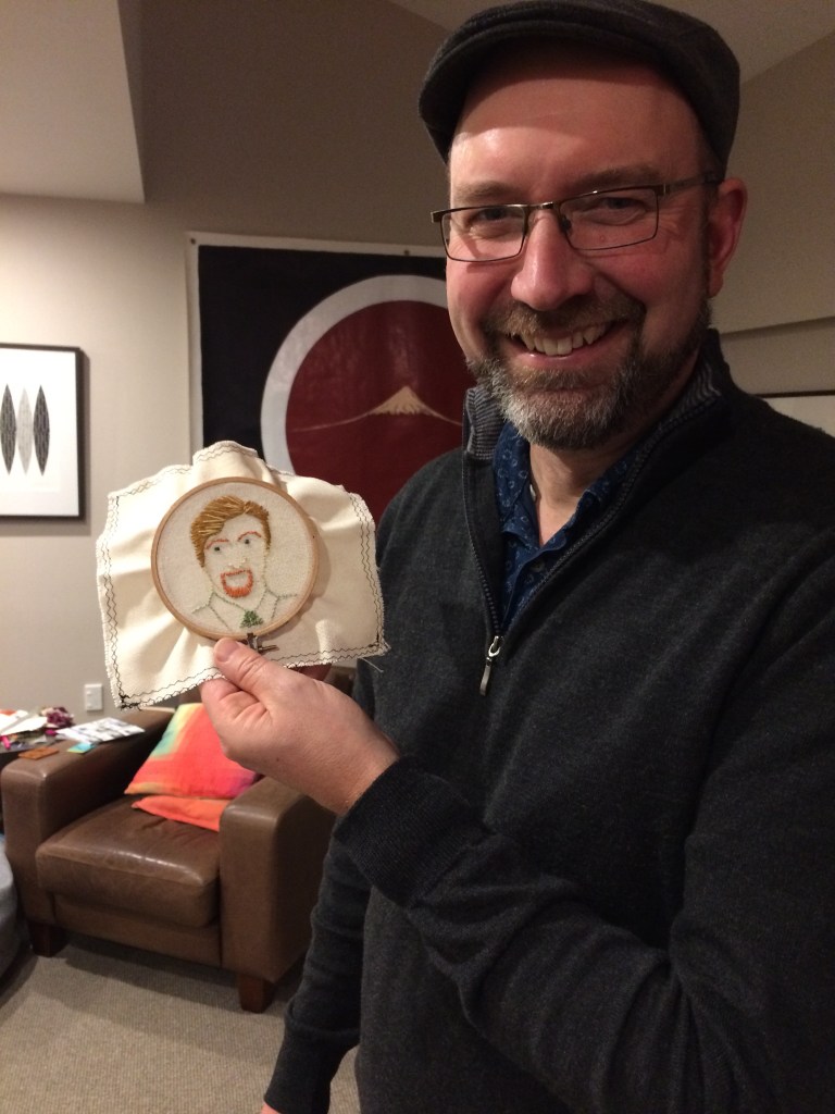 Chris picked me up from the bus stop and I spent another night with him and his family. Their kindness and easy banter cheered me up, as did Chris’s first attempt at embroidery. They’re a crafty, creative bunch, Chris’s family, and he was inspired to have a go when his daughter Olivia came home with it for homework. He chose a portrait of Murray off Flight of the Conchords, partly because Murray is Chris’s surname. So here they are, Murray by Murray: